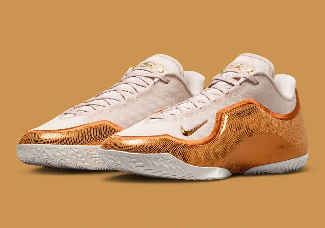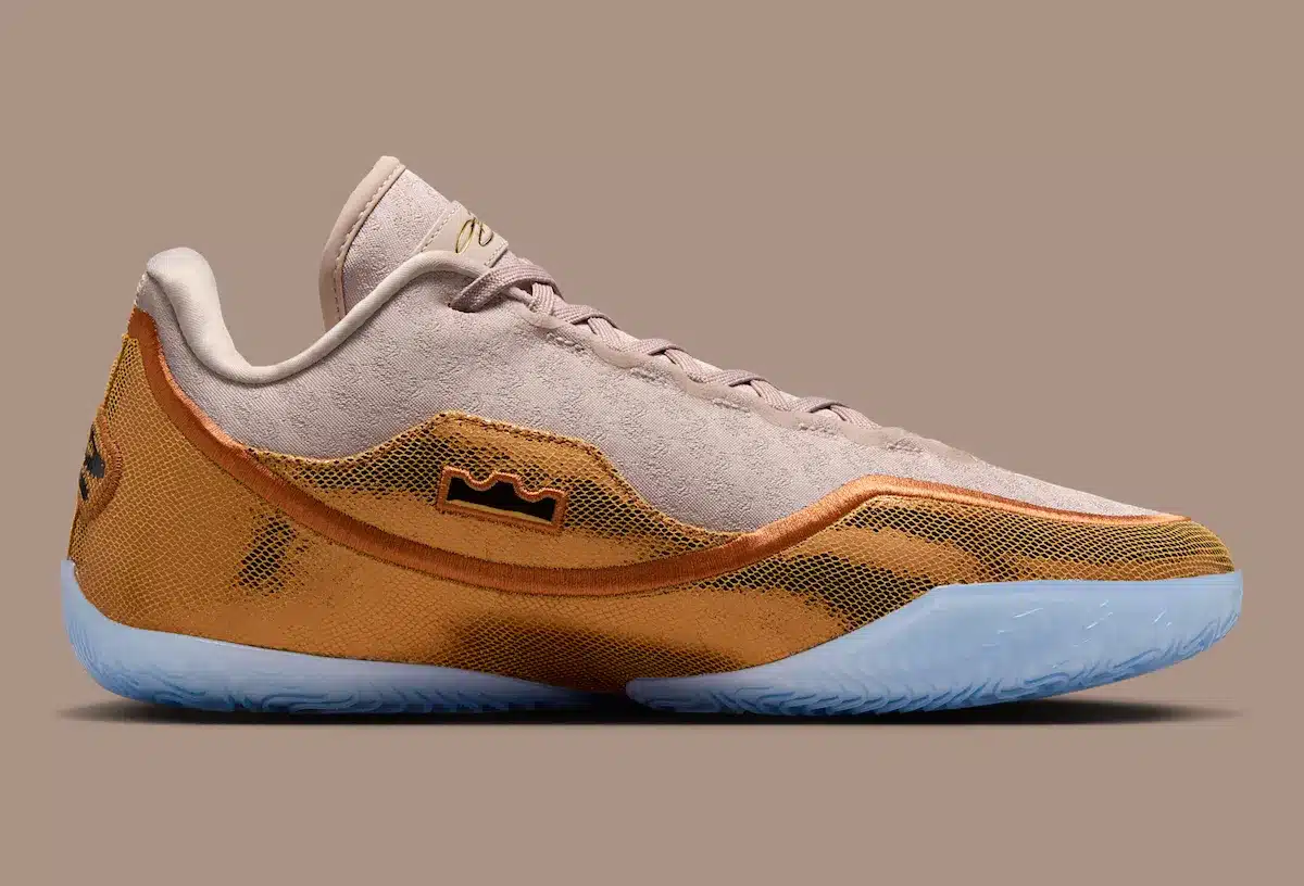 . Crown-thema – Een bronzen mudguard in de vorm van een kroon siert de schoen, een visuele knipoog naar LeBrons bijnaam “The King”.