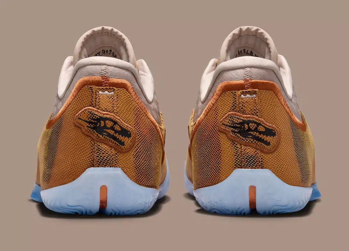 . Tonaliteit en grafische details – De sneaker heeft een aardetint upper in tan met dinosaurische motieven en meteorieten-embroidery, wat symbool staat voor de “ondergang” van de Raptors in die serie.